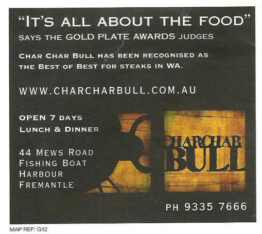 This time we headed out to the Char Char Bull steakhouse out on the waterfront. Yet again we had another top quality meal with excellent service and yet again we washed down steak and chips with some of Western Australia’s finest wines both red and white. We were eating well in Freemantle there was no doubt about that, in many ways it was so brilliantly simple that a part of me would have been able to carry on doing the same thing night after night for a very long time, days into weeks, weeks into months, forever even. Just think it was the combination of great food and attentive service which made all the places where we’d eaten in Freemantle so damn excellent, that and the fact it was accompanied by plenty of alcohol. As far as both Dad and I were concerned it was exactly what we wanted to do of an evening when on holiday; to drink a couple of cold beers whilst having a good chat, followed by a meal of usually fish or steak and chips washed down with a couple of glasses of wine, white or red, and usually from Margaret River.
